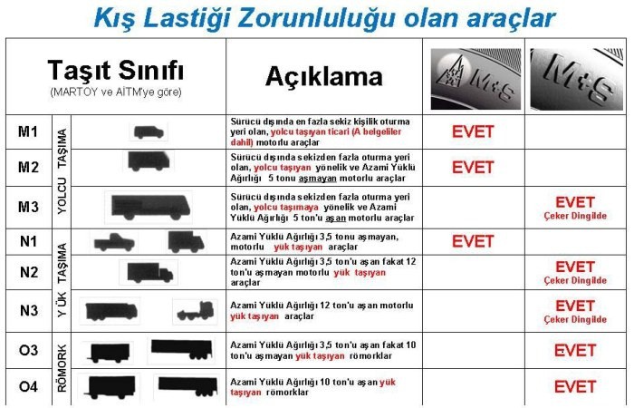Özellikle kamyon, çekici, tanker, otobüs, minibüs ve kamyonet türü araçlarda başta kış lastiği olmak üzere, kar lastiği, lastik diş derinlikleri, hava basıncı ile patinaj zinciri, çekme halatı, takoz gibi avadanlıkların araçların teknik yapısına uygun olarak bulundurulması ve kullanılır durumda olması kış mevsimi süresince aranacaktır.. Kamyon, çekici, tanker ve otobüs türü araçların tahrikli dingilleri üzerindeki tüm lastiklerinin kış lastiği olması gerekmektedir. Kamyonet, minibüs ve otomobillerin tüm lastikleri ile yarı römork ve römorkları çeken çekicilerdeki tahrikli dingiller üzerindeki lastiklerin (çeker lastikleri) kış lastiği olması zorunludur. Kamyon, çekici, tanker, otobüs türü araçların lastiklerinin yanaklarında (M+S) işareti; minibüs, otomobil ve kamyonet türü araçların lastiklerinin yanaklarında ise (M+S) işareti veya (M+S) işareti ile birlikte kar tanesi (snowflake) işareti veya sadece kartanesi (snowflake) işareti aranacaktır